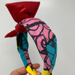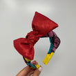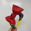 The fabric on the band of this hairband features a Sally-inspired patchwork design, with a red bow to represent her flowing red hair.